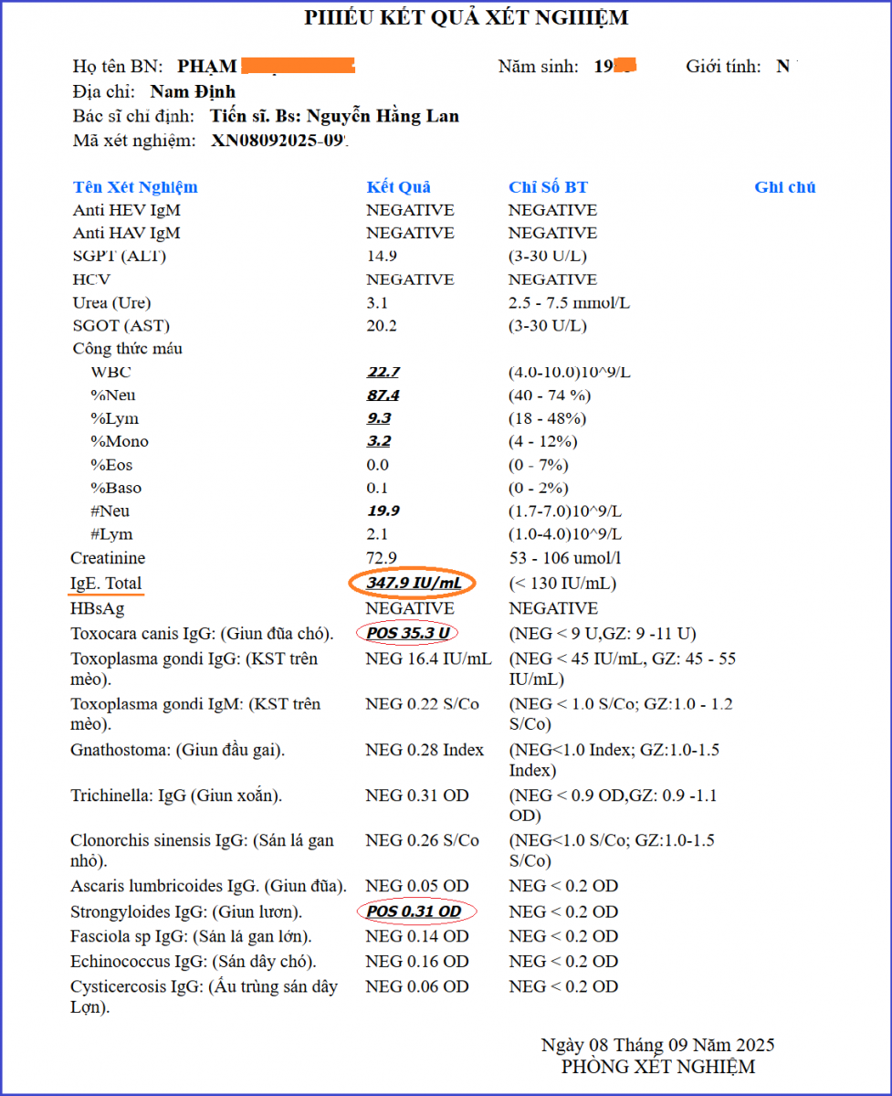 Hình ảnh: Phiếu kết quả Xét nghiệm của một bệnh nhân có chỉ số IgE tăng cao do nhiễm ấu trùng giun sán