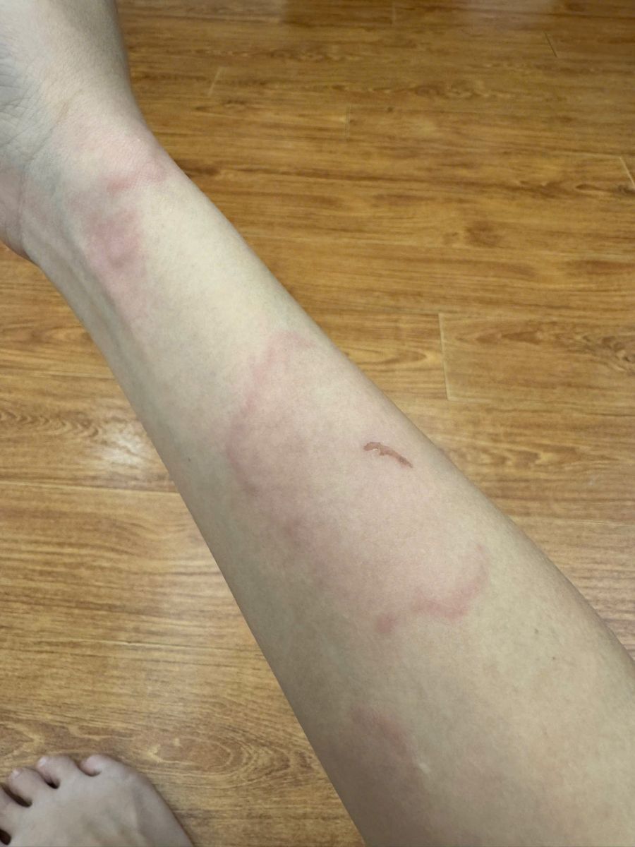 Dựa trên hình ảnh bạn gửi, có thể thấy trên vùng cẳng tay xuất hiện nhiều mảng đỏ dạng vòng, bờ không đều, lan loang rộng và có xu hướng biến mất rồi xuất hiện ở vị trí khác — đây là dạng tổn thương rất thường gặp trong các bệnh lý dị ứng đặc biệt và nhiễm ấu trùng giun sán di chuyển dưới da.