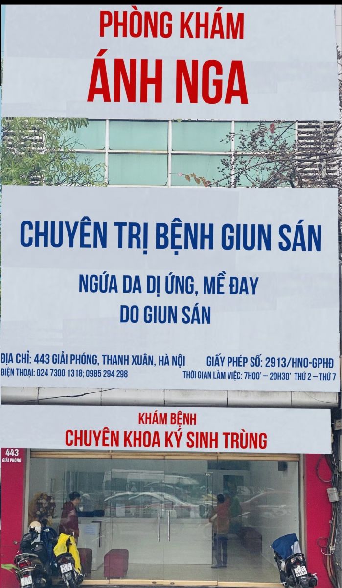 Phòng khám Ánh Nga Xét Nghiệm Và Điều Trị Bệnh Giun Sán, Điều trị các bệnh mẩn ngứa da dị ứng do giun sán, bệnh sán não, sán trong gan và các bệnh ký sinh trung giun sán trong máu. Liên hệ xét nghiệm và điều trị ký sinh trùng giun sán tại Phòng khám bệnh giun sán, số 443 đường Giải Phóng, Hà Nội. Là phòng khám Chuyên khoa Nội ký sinh trùng uy tín tại Hà Nội. Giờ mở của từ 7 giờ sáng đến 17 giờ chiều, hoạt động từ thứ 2 đến hết ngày Chủ Nhật. Phòng khám do các bác sĩ Chuyên khoa Ký sinh trùng giàu kinh nghiệm thành lập, trực tiếp khám và điều trị bệnh giun sán, đảm bảo mọi quyền lợi cho người bệnh./.